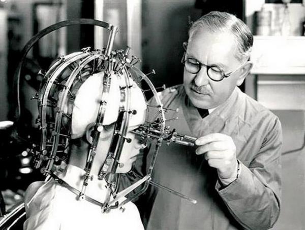 Это обычная машина для химической завивки волос, используемая в Германии в конце 20-х годов, правда, сегодня она выглядит, как некий прибор безумного ученого для экспериментов над мозгом.
